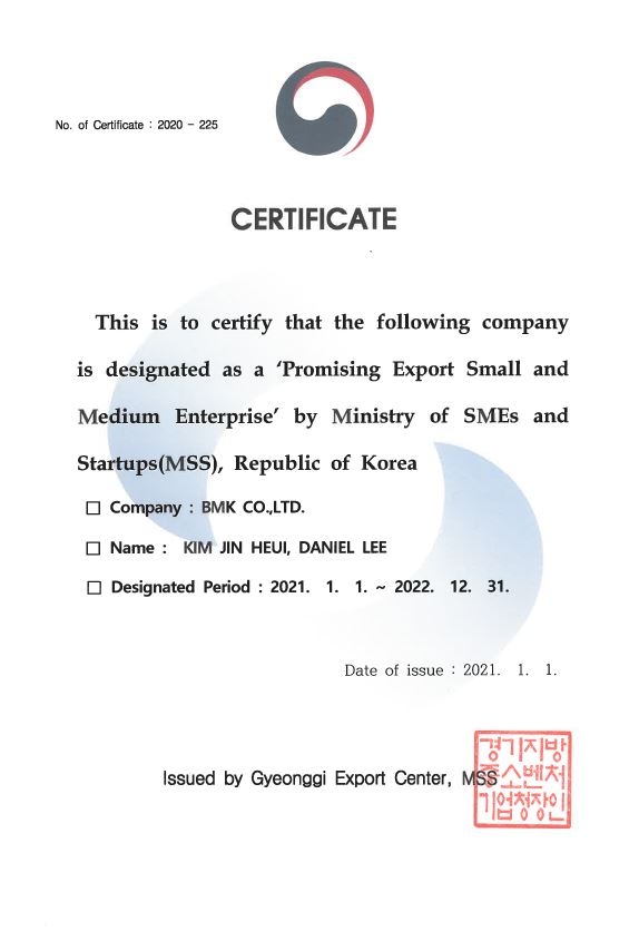 Promising Export Small and Medium Enterprise 페이지 정보 작성자 비엠케이 작성일21-01-22 10:56 조회2,697회 관련링크 이전글 다음글 목록 본문 'Promising Export Small and Medium Enterprise' by Ministry of SMEs and Startups(MSS), Republic of Korea 이전글 다음글 목록